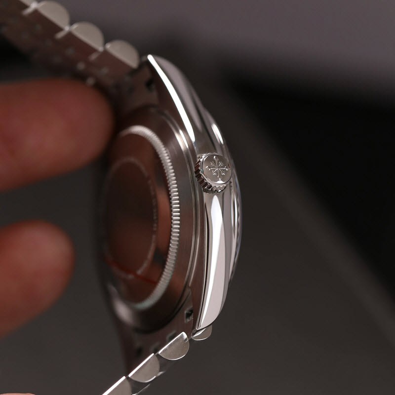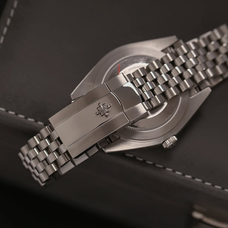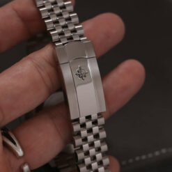 Dây đeo kim loại màu bạc được chế tác từ thép không gỉ 316L, loại vật liệu được sử dụng phổ biến trong ngành chế tác đồng hồ cao cấp, vừa bền bỉ vừa sáng bóng theo thời gian. Từng mắt dây được đánh bóng xen kẽ chải xước, tạo nên hiệu ứng ánh sáng tinh tế khi đeo trên tay.