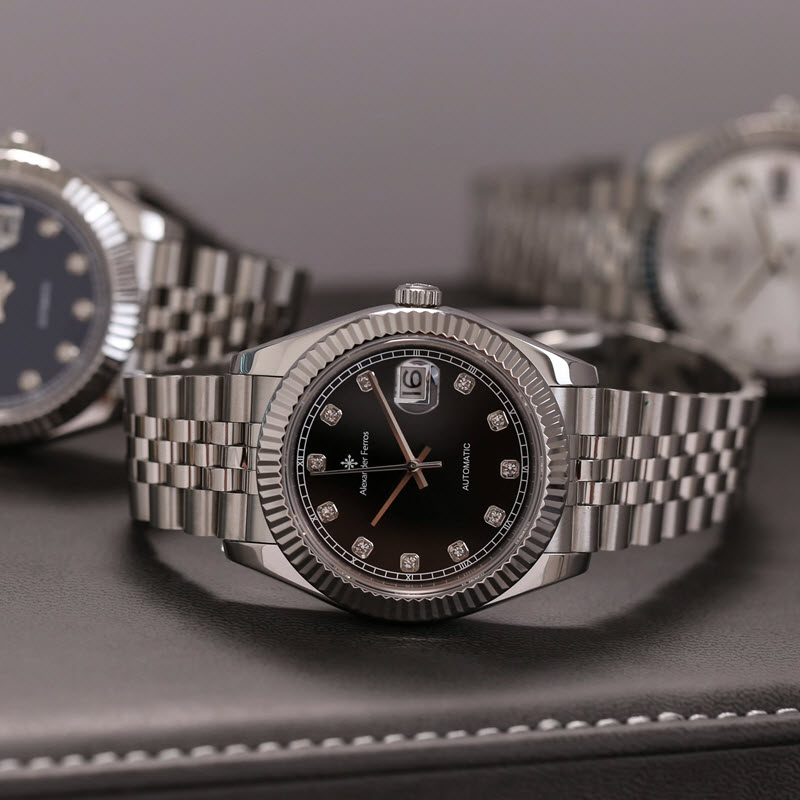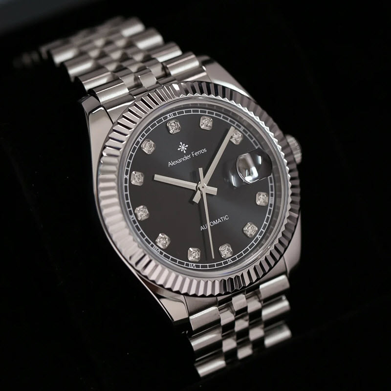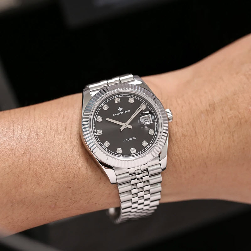 Ngay từ cái nhìn đầu tiên, đồng hồ nam Alexander Ferros 8132S/01 đã toát lên phong thái của một món phụ kiện thời thượng. Sản phẩm sở hữu mặt số đen huyền bí, nổi bật với cọc số đính đá pha lê cao cấp, tạo nên vẻ cuốn hút khác biệt. Vành đồng hồ dạng rãnh truyền thống mang lại chiều sâu thị giác, gợi nhớ đến những thiết kế cổ điển, nhưng vẫn giữ nét hiện đại nhờ bố cục mặt số cân đối.
