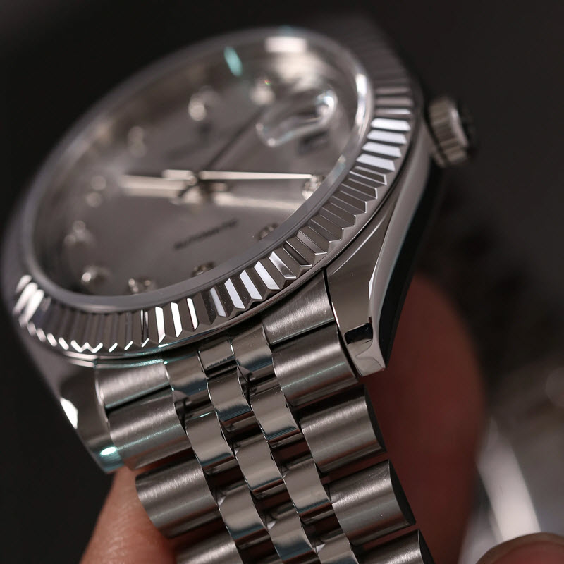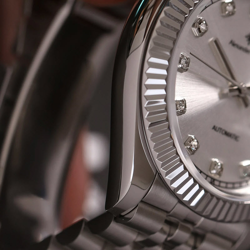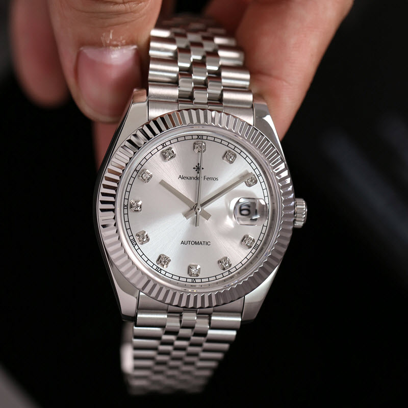 Điểm nhấn đầu tiên chính là vành đồng hồ dạng rãnh khía tinh xảo. Chi tiết này không chỉ tạo hiệu ứng bắt sáng lấp lánh mà còn tăng thêm chiều sâu và sự sang trọng cho tổng thể. Tiếp đến, mặt số màu trắng bạc với hiệu ứng chải tia tinh tế thu hút mọi ánh nhìn. Thay vì cọc số truyền thống, Alexander Ferros 8132S/02 được trang bị 8 viên đá quý lấp lánh tại các vị trí giờ. Sự kết hợp này mang đến vẻ đẹp vừa mạnh mẽ, vừa quý phái.