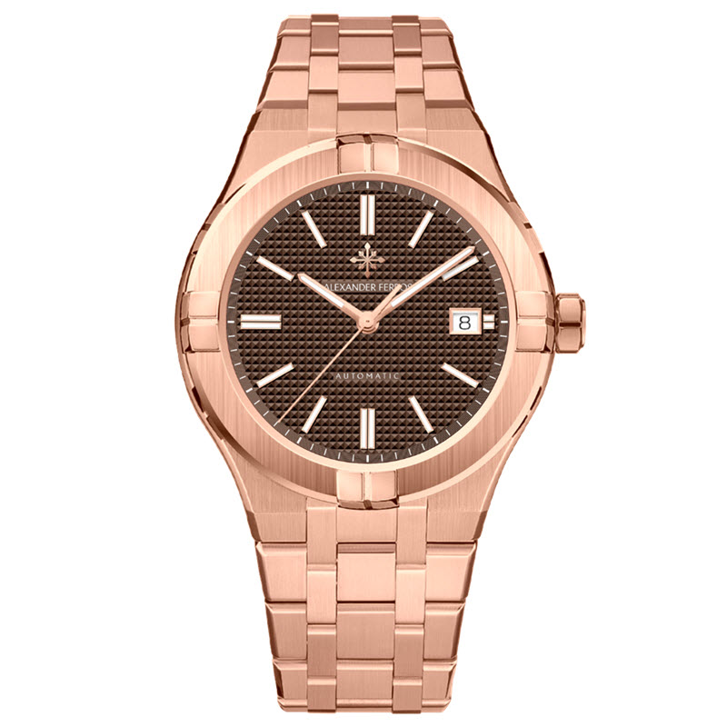 Mặt số màu nâu chocolate được thiết kế với họa tiết vân caro nổi 3D, tạo chiều sâu và hiệu ứng ánh sáng tinh tế. Các cọc số và kim được phủ dạ quang trắng, giúp người dùng dễ dàng đọc giờ trong điều kiện thiếu sáng. Viền bezel được cắt vát góc cạnh, tạo cảm giác nam tính và hiện đại, một điểm nhấn đặc trưng trong các dòng đồng hồ cao cấp của Alexander Ferros.