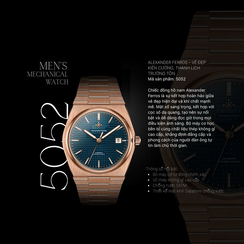 Đối với những quý ông hiện đại, một chiếc đồng hồ nam không chỉ dùng để xem giờ. Đó còn là một phụ kiện thể hiện phong cách, là điểm nhấn hoàn thiện diện mạo và là cách một người đàn ông gửi gắm dấu ấn riêng của mình. Mẫu đồng hồ Alexander Ferros 5052R/05 ra đời để đáp ứng chính những nhu cầu ấy.