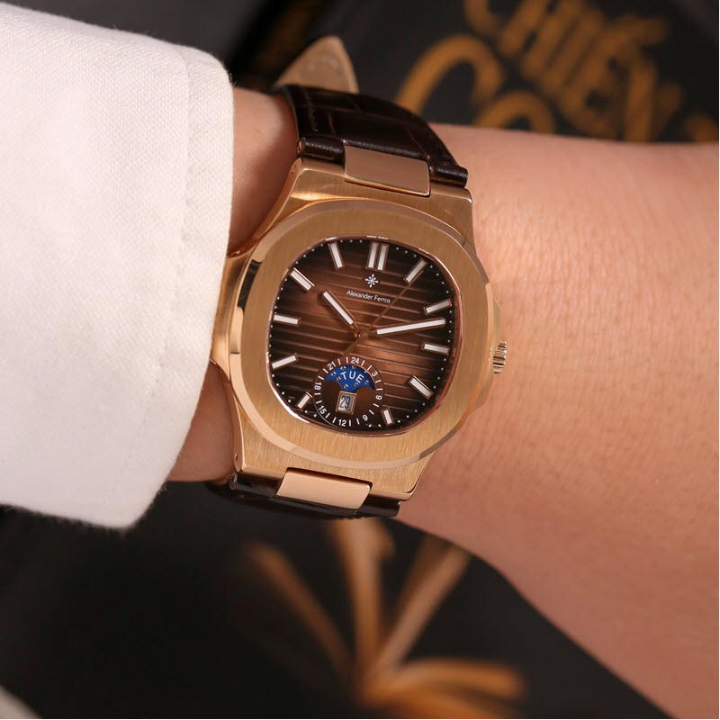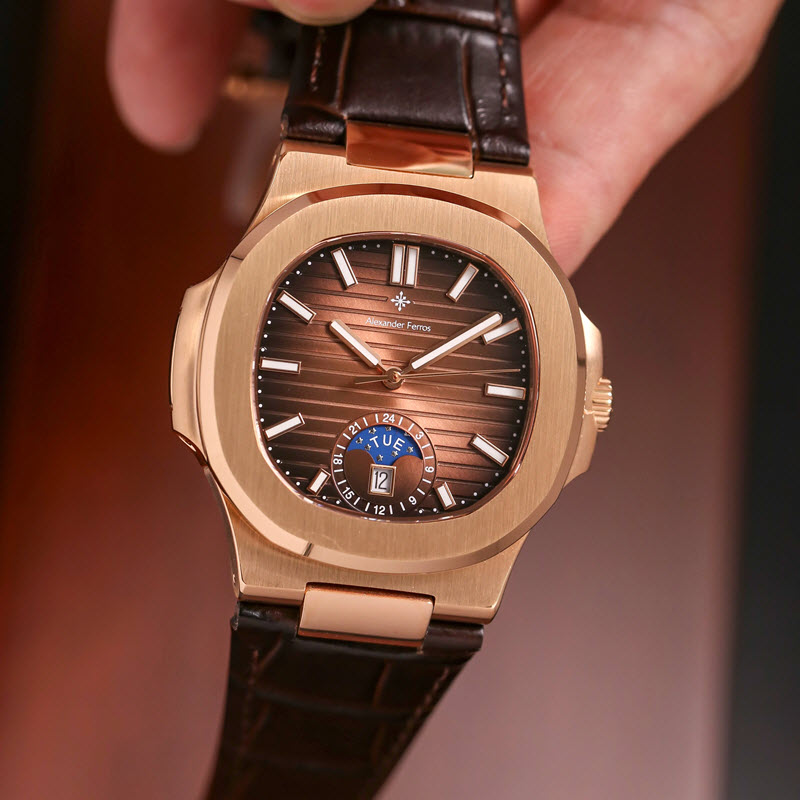 Đẳng cấp và lịch lãm, đồng hồ nam Alexander Ferros 6122R-08 dùng máy cơ Miyota Nhật Bản, mang đến sự ổn định và độ chính xác cao. Thiết kế mặt số nâu vintage và dây da nâu vân cá sấu, biến sản phẩm này thành biểu tượng thời trang cao cấp trên cổ tay.