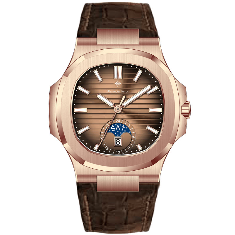 Vỏ đồng hồ được làm từ thép không gỉ 316L cao cấp, phủ lớp PVD vàng hồng bóng bẩy, gam màu tượng trưng cho sự ấm áp, thành công và tinh tế. Các cạnh viền được vát cong mềm mại, kết hợp giữa bề mặt chải xước và đánh bóng tạo hiệu ứng ánh sáng tương phản đầy nghệ thuật. Núm chỉnh giờ khắc logo đặc trưng Alexander Ferros, thể hiện sự trau chuốt đến từng chi tiết nhỏ.