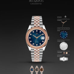 Cọc số đính đá hoàn thiện thủ công giúp mặt đồng hồ vừa hiện đại vừa sang trọng, tạo nên diện mạo cuốn hút ngay từ ánh nhìn đầu tiên. Sự hòa quyện giữa xanh navy và sắc vàng hồng mang đến tổng thể hài hòa, đẳng cấp.