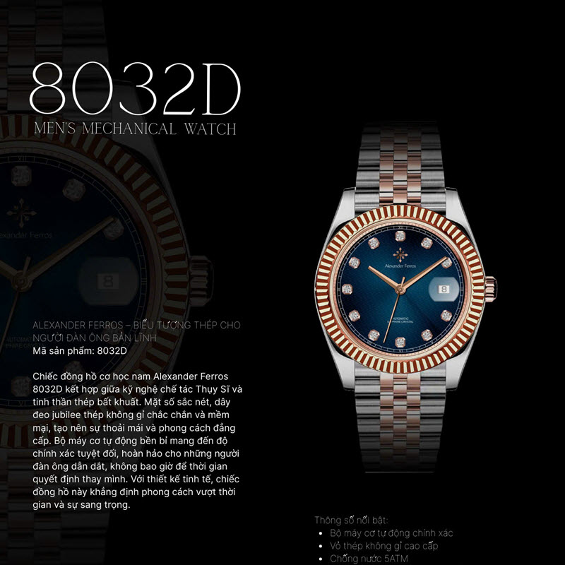 Ngoài ra, dây demi bạc phối vàng hồng được chế tác từ thép không gỉ 316L mang đến độ sáng bóng và bền bỉ vượt trội. Cấu trúc các mắt dây được hoàn thiện trau chuốt, tạo cảm giác ôm tay thoải mái và chắc chắn khi đeo. Khả năng chống nước 5 ATM cho phép đeo đồng hồ Alexander Ferros khi rửa tay, đi mưa nhẹ hoặc trong các hoạt động hàng ngày mà không ảnh hưởng đến bộ máy bên trong. Đây là yếu tố quan trọng cho những ai cần sự tiện lợi và linh hoạt.