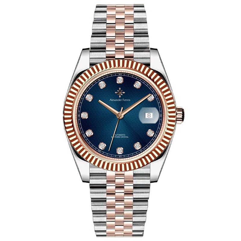Một trong những điểm nổi bật nhất của đồng hồ nam Alexander Ferros 8032D/05 chính là phần vành khía fluted bezel màu vàng hồng sang trọng. Khi ánh sáng chiếu vào, từng rãnh khía tạo hiệu ứng phản xạ vô cùng tinh tế, giúp sản phẩm thu hút ánh nhìn mà vẫn giữ được nét lịch lãm đúng mực của một chiếc đồng hồ cao cấp.
