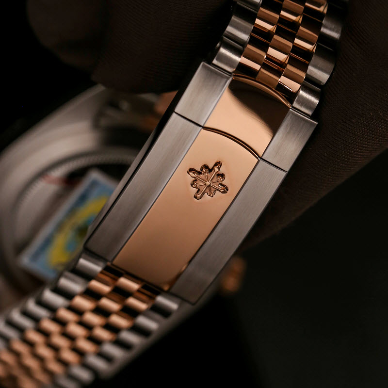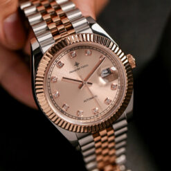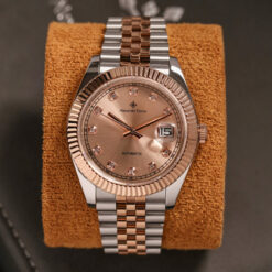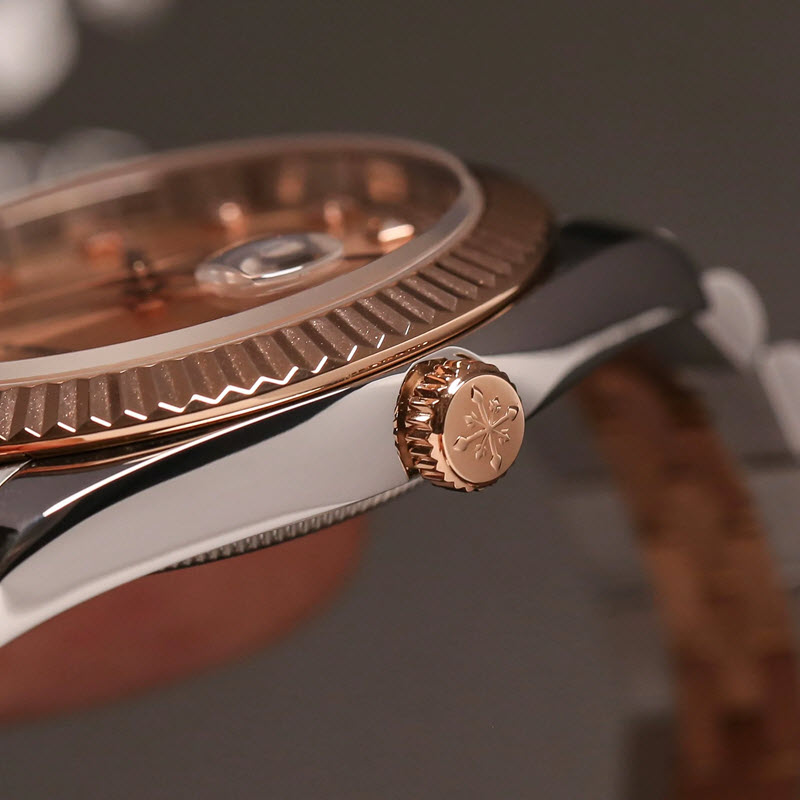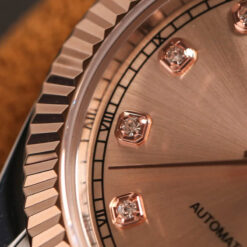 Trên nền mặt số ấy, 12 cọc giờ đính đá tinh xảo được sắp xếp hài hòa, phản chiếu ánh sáng lung linh ở mọi góc nhìn. Bộ kim đồng hồ được phủ tông vàng hồng đồng điệu với niềng và núm vặn, tạo nên tổng thể sang trọng và đồng nhất, một chi tiết nhỏ nhưng thể hiện đẳng cấp của một đồng hồ chính hãng được hoàn thiện tỉ mỉ.