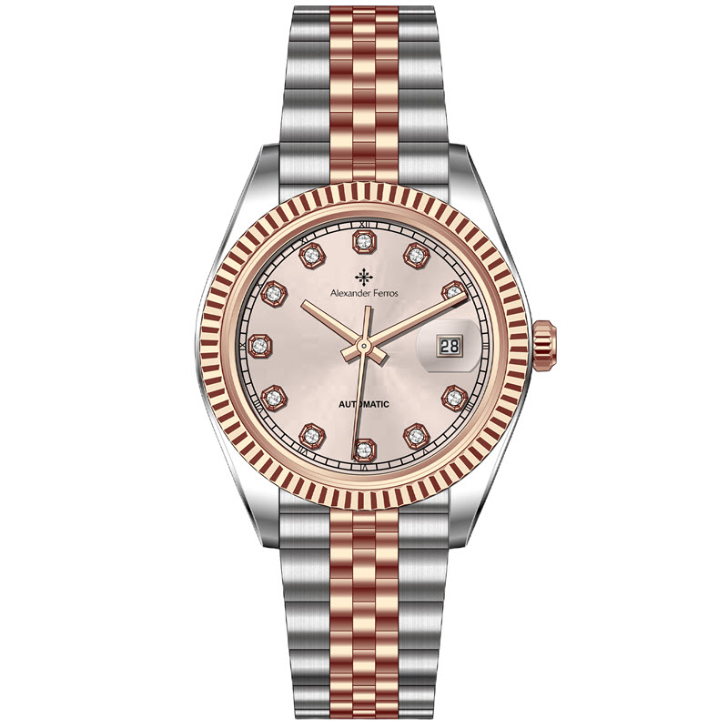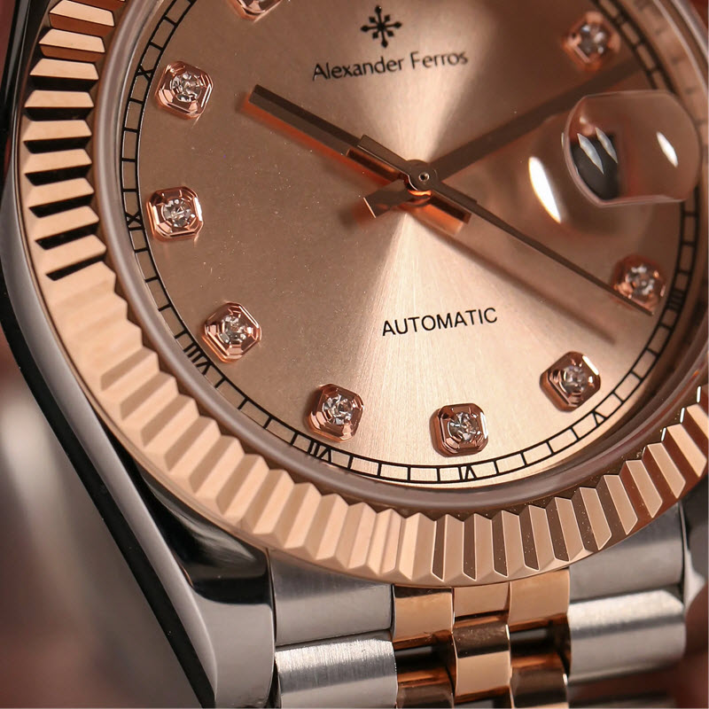 Đồng hồ nam Alexander Ferros 8132D/15 gây ấn tượng mạnh mẽ ngay từ cái nhìn đầu tiên với gam màu bạc và vàng hồng demi thanh lịch. Vành bezel khía cạnh được mài dày bản, tỏa sáng với ánh kim tinh tế, làm nổi bật phần mặt số màu champagne nhẹ nhàng nhưng đầy cuốn hút.