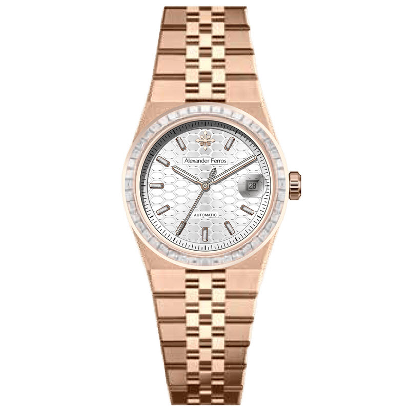 Mẫu Alexander Ferros 8181R/02 mang trong mình phong cách thanh lịch pha chút hiện đại, dễ dàng phối hợp cùng nhiều loại trang phục, từ vest công sở đến trang phục dự tiệc. Điểm nhấn đầu tiên là phần dây demi vàng hồng nguyên khối được chế tác bằng công nghệ mạ PVD cao cấp, giúp giữ màu bền lâu và sáng bóng theo thời gian. Bên cạnh đó, phần mặt số bạc được chạm khắc họa tiết tổ ong tinh tế và hoàn mỹ. Sự kết hợp giữa sắc vàng hồng ấm áp và ánh bạc nhẹ nhàng tạo nên tổng thể hài hòa, trang nhã nhưng không kém phần nổi bật cho mẫu đồng hồ nam này.