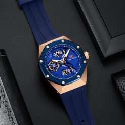 Thiết kế mặt số độc đáo, lộ máy, giúp bạn dễ dàng quan sát hoạt động bên trong đồng hồ. Dây đeo bằng silicon cao cấp không chỉ êm ái mà còn đảm bảo độ bền và thoải mái khi đeo trong thời gian dài.