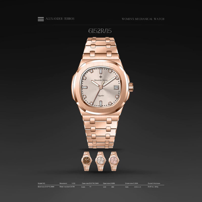 Toàn bộ vỏ và dây đeo của Alexander Ferros 6152R/15 được chế tác từ thép không gỉ 316L mạ PVD màu vàng hồng cao cấp, mang lại độ bền màu và vẻ ngoài óng ánh, quý phái. Nhưng sự khác biệt lớn nhất nằm ở mặt số khi 6152R/15 sở hữu mặt số trắng kem mềm mại. Màu trắng kem tạo nên một cái nhìn sạch sẽ, thoáng đãng và cổ điển, làm nổi bật sắc vàng hồng của kim và vỏ. Sự kết hợp màu sắc này mang lại một tổng thể hài hòa, dịu mắt, chứng minh đây là một chiếc đồng hồ nữ đơn giản nhưng có gu thẩm mỹ tinh tế.