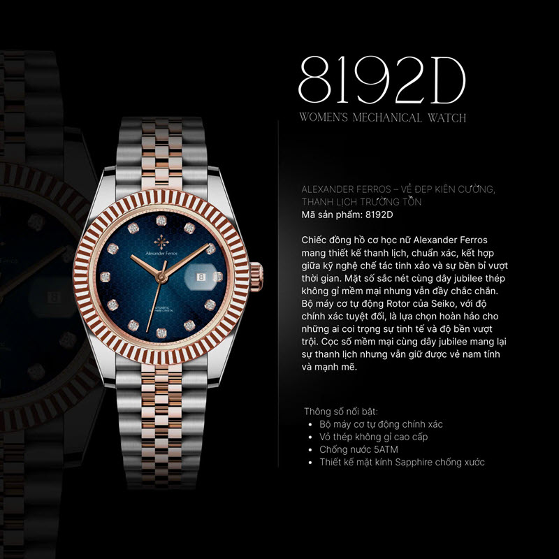 Alexander Ferros 8192D/05 là một tuyên ngôn về vẻ đẹp kiên cường và thanh lịch dành cho phái nữ hiện đại. Nó là một tác phẩm nghệ thuật chế tác tinh xảo, kết hợp hoàn hảo giữa thiết kế cổ điển vượt thời gian và công nghệ cơ khí hiện đại.