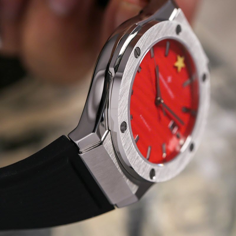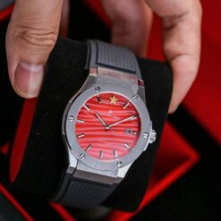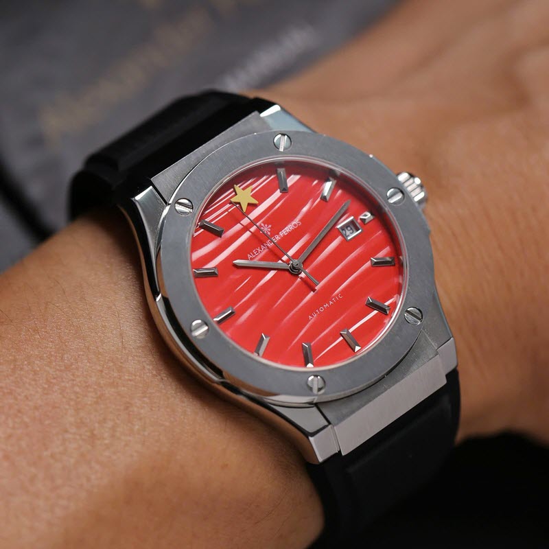 Ngay từ cái nhìn đầu tiên, đồng hồ nam đeo tay Alexander Ferros 6162S-03 gây ấn tượng với mặt số đỏ nổi bật cùng những đường vân sóng tạo hiệu ứng chuyển động mềm mại lấy cảm hứng từ lá cờ Việt Nam. Và điểm nhấn là ngôi sao vàng ở vị trí 12 giờ, biểu trưng cho khát vọng vươn lên dẫn đầu, mang đậm tinh thần dân tộc.