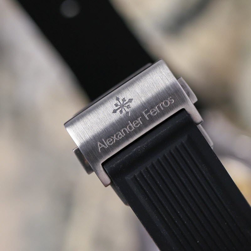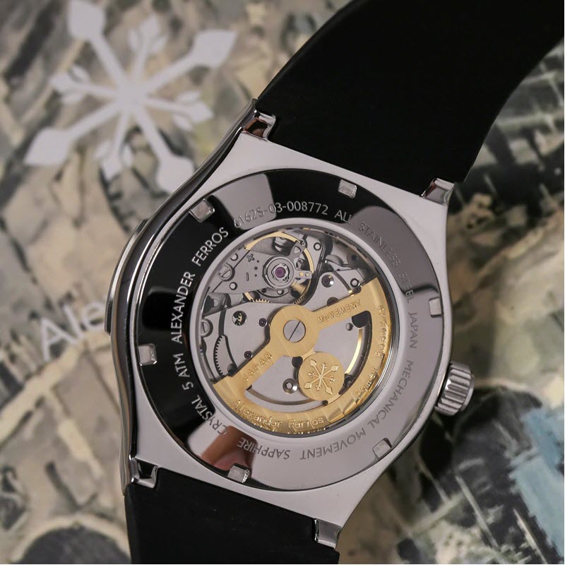Ẩn sau lớp kính trong suốt ở mặt sau là bộ máy cơ automatic Nhật Bản Miyota, nổi tiếng với độ chính xác và độ bền vượt trội. Không cần pin, chiếc đồng hồ cơ automatic này hoạt động dựa trên chuyển động cổ tay, mang lại cảm giác kết nối tự nhiên và tinh tế. Bánh đà mạ vàng được khắc logo thương hiệu Alexander Ferros tạo nên vẻ đẹp cơ khí đầy mê hoặc, nơi người đeo có thể chiêm ngưỡng nhịp chuyển động của thời gian một cách sống động.